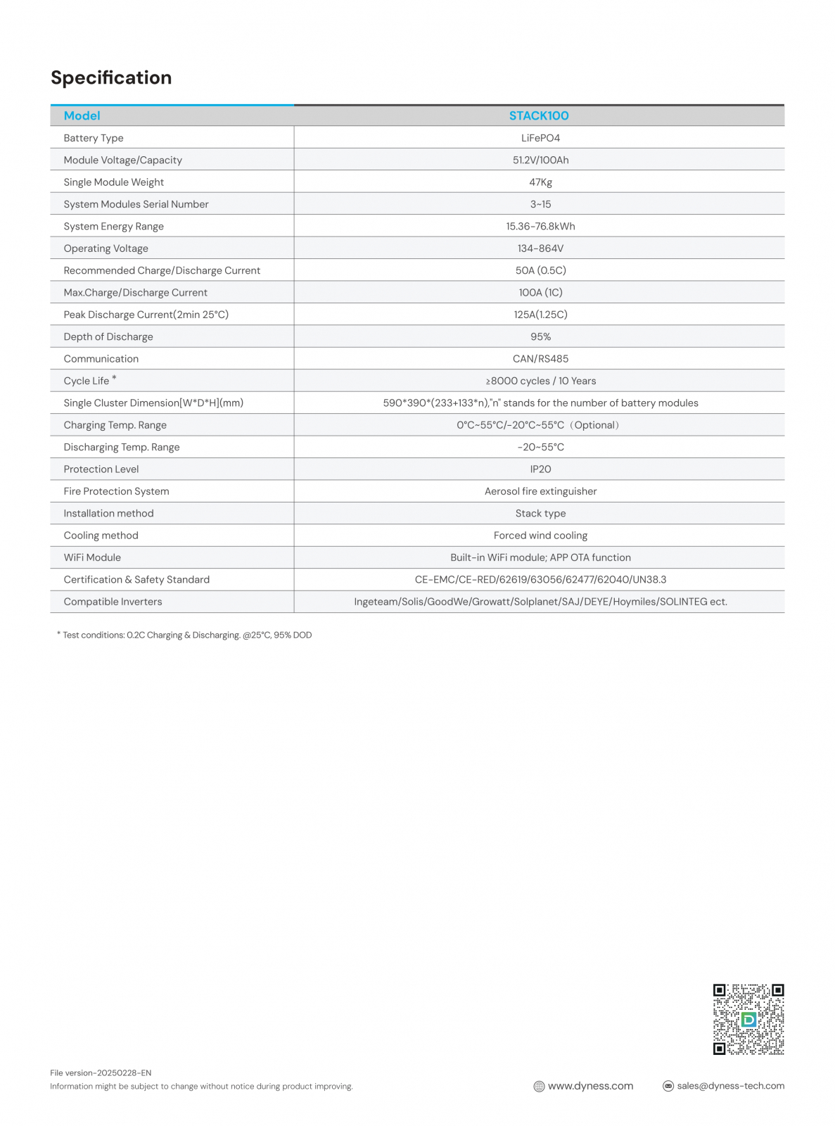 tensiune ridicata(HV) Dyness STACK100-3s cu o capacitate de stocare de 15.36 kWh este proiectata pe baza celulelor LiFePO4 (Litiu-Fier-Fosfat). Aceasta adopta tehnologia avansata a celulelor LFP (Litiu-Fier-Fosfat) pentru performata ridicata, siguranta maxima si un ciclu de viata mai lung(8000 de cicluri de incarcare/descarcare). Bateria Dyness STACK100 are un design compact si modular cu o capacitate ridicata de stocare.