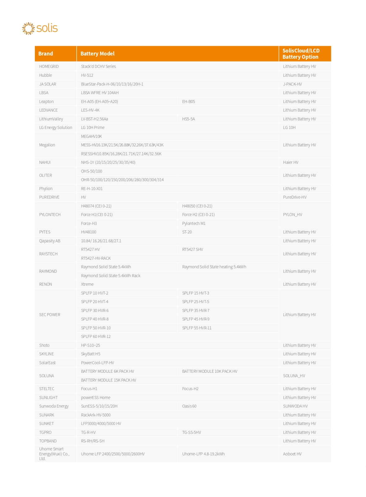 • Lista bateriilor compatibile cu invertoarele Solis HV