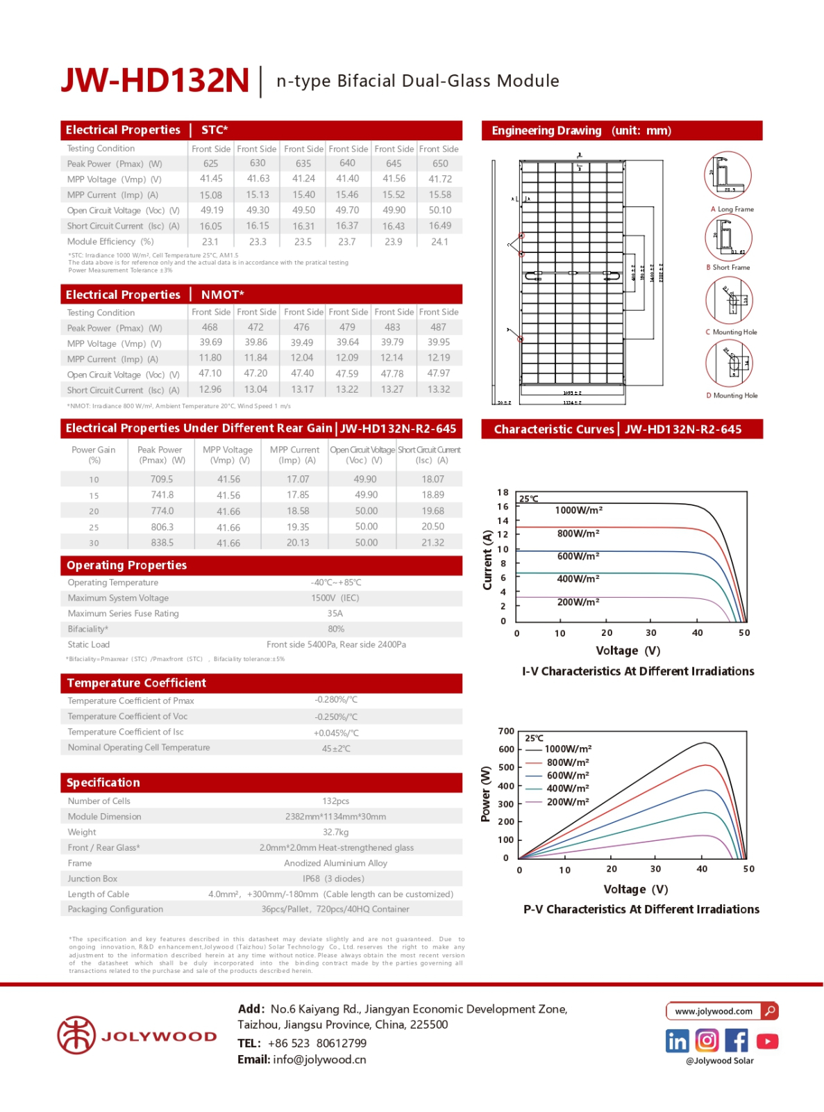 Jolywood JW Plus de 630W este un panou solar bifacial, ceea ce inseamna ca poate capta lumina soarelui atat pe partea din fata, cat de pe cea din spate a panoului. Structura transparenta din sticla dubla a panoului permite absorbtia luminii reflectate si difuzate de sol sau de suprafetele inconjuratoare de catre partea din spate. In functie de conditiile de instalare, panourile bifaciale pot creste randamentul energetic cu 10% pana la 30% in comparatie cu panourile monofaciale traditionale.