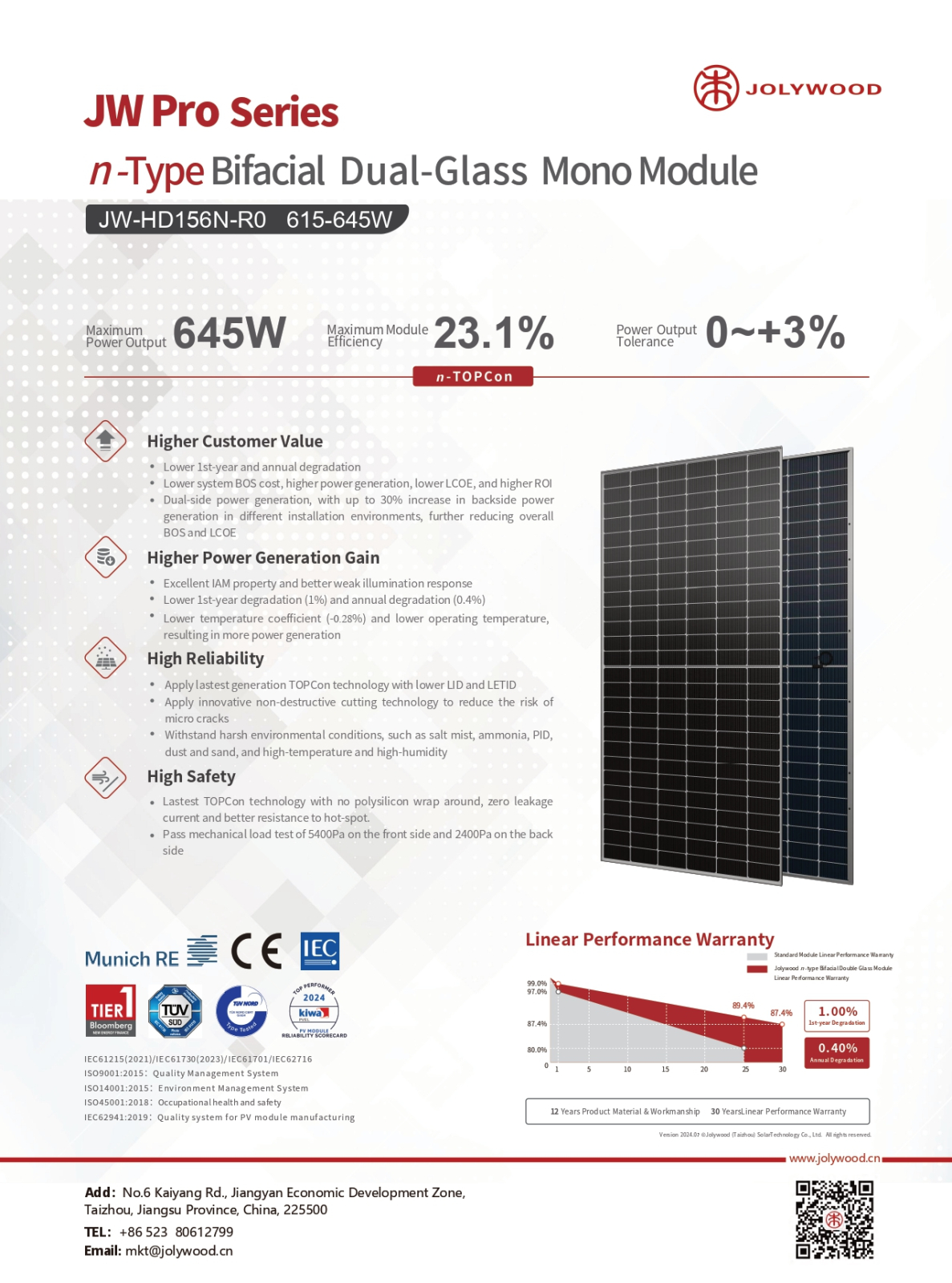 Panou fotovoltaic bifacial Jolywood JW Pro 640W - JW-HD156N-R0-640W